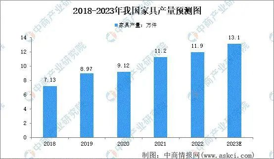 作為全球家具生產(chǎn)中心,早在2006年中國家具產(chǎn)業(yè)產(chǎn)值已躍居世界第一位,中國已然成為世界家具生產(chǎn)、消費(fèi)及出口大國。2022年我國家具業(yè)產(chǎn)量11.9萬件,同比增長5.9%。預(yù)計2023年我國家具行業(yè)產(chǎn)量將達(dá)13.1萬件,同比增長10.05%。