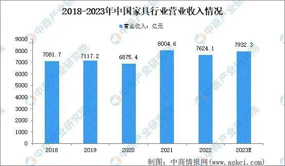 數(shù)據(jù)顯示,2022年受疫情和外貿(mào)等因素影響,我國家具行業(yè)規(guī)模以上企業(yè)實現(xiàn)營業(yè)務(wù)收入7624.1億元,同比下降-4.8%?;仡?018-2022年家具制造業(yè)營業(yè)收入情況:近年來,我國家具制造業(yè)營業(yè)收入總體呈小幅度下降趨勢,預(yù)計2023年我國家具行業(yè)復(fù)蘇營業(yè)收入將達(dá)7932.3億元。