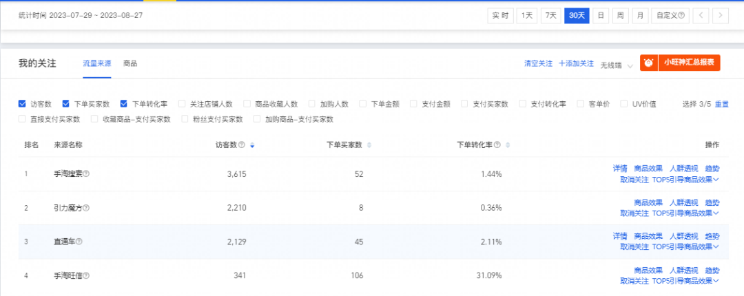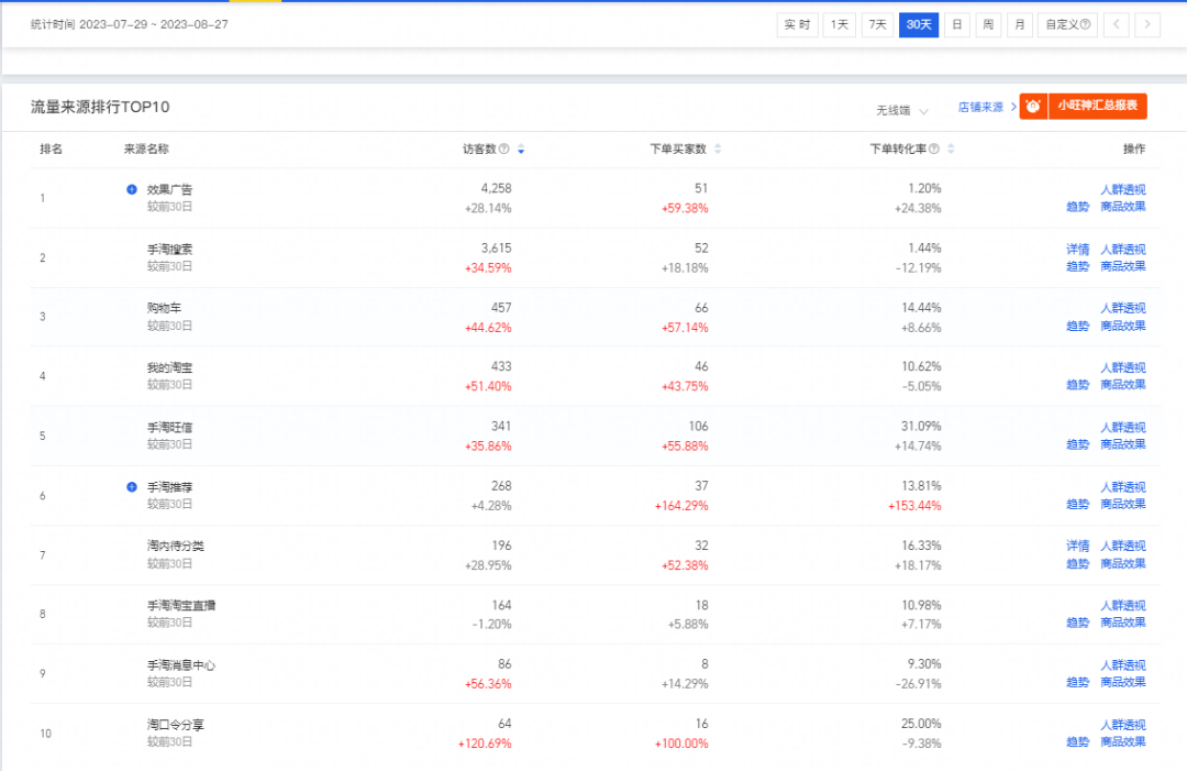 3.店鋪核心詞和轉(zhuǎn)化人群確定之后,看整體店鋪流量結(jié)構(gòu),流量結(jié)構(gòu)轉(zhuǎn)化率對比,免費(fèi)流量轉(zhuǎn)化高就重點規(guī)劃周期增加免費(fèi)渠道流量,優(yōu)化店鋪人群,階段轉(zhuǎn)化穩(wěn)定提高。